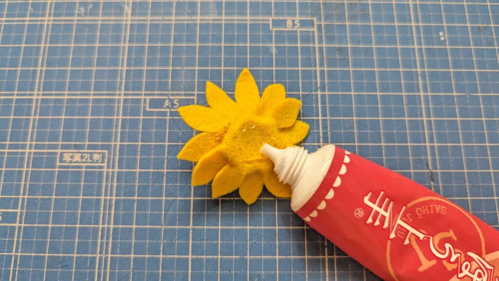 8.ヒマワリ④の花びらを少しずらして重ね、縫い合わせる。